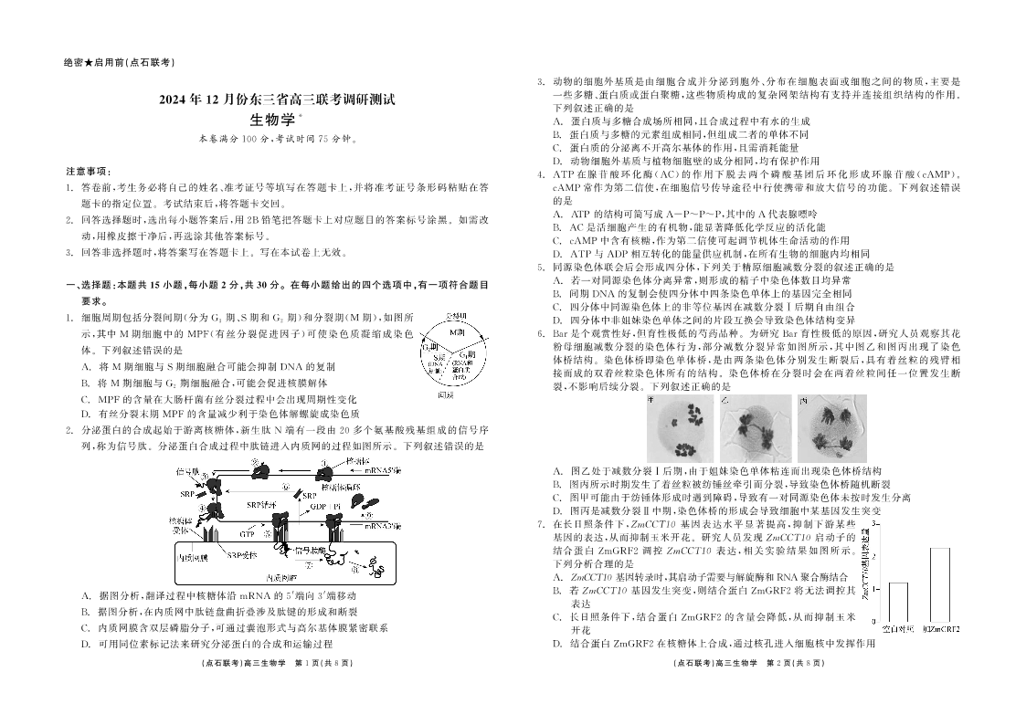 2024年12月份东三省高三联考调研测试 生物
