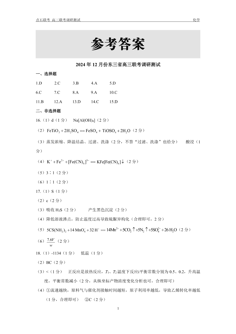 2024年12月份东三省高三联考调研测试 化学答案