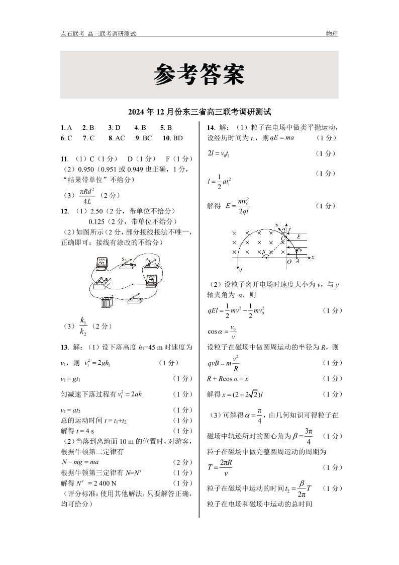2024年12月份东三省高三联考调研测试 物理答案