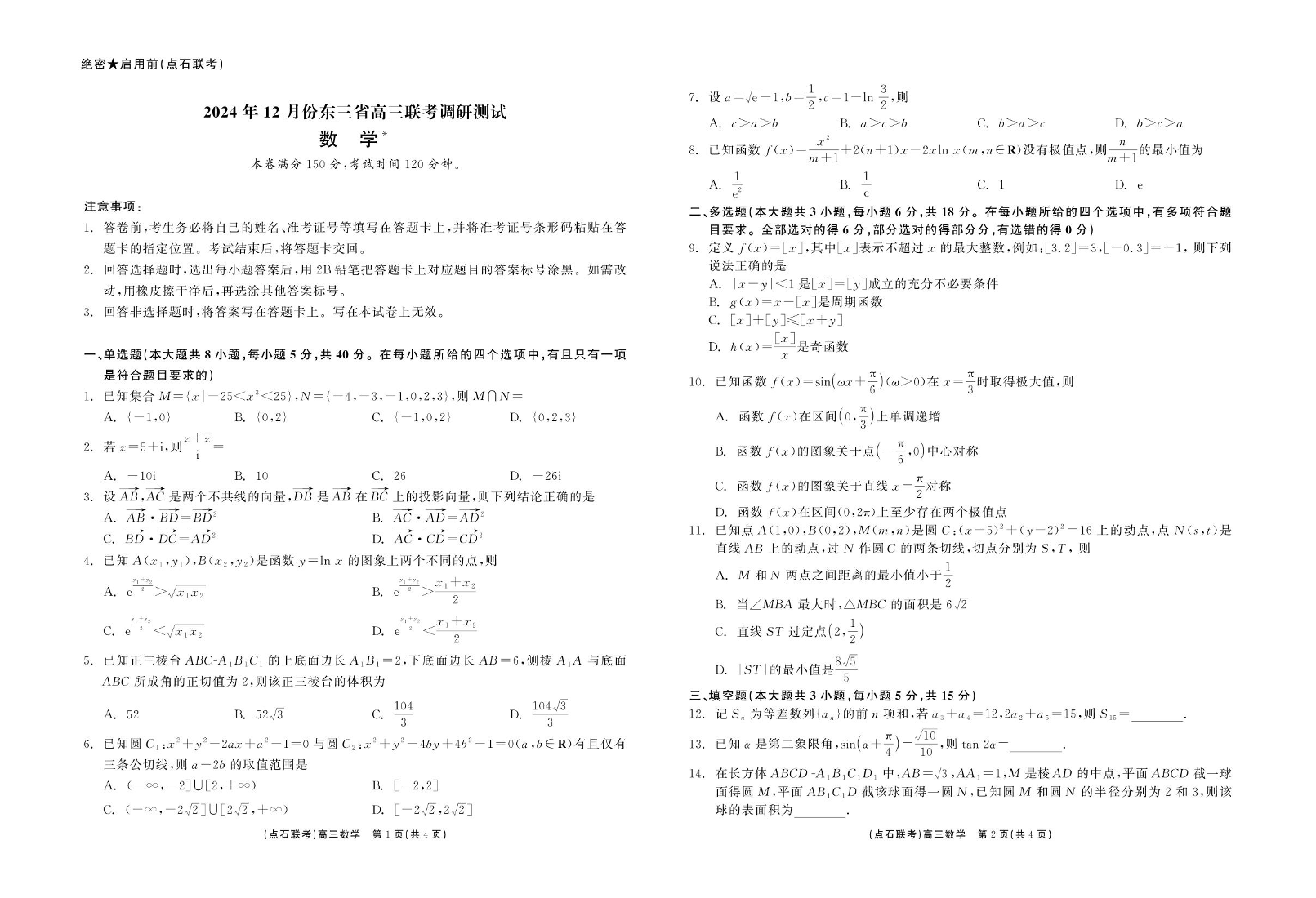 2024年12月份东三省高三联考调研测试 数学