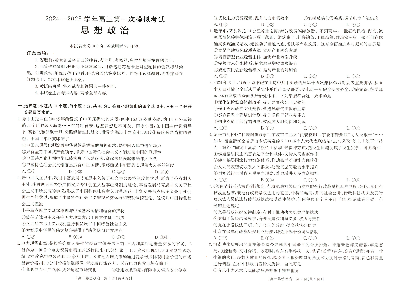 河南省新乡市2024年12月高三年级第一次模拟考试 政治