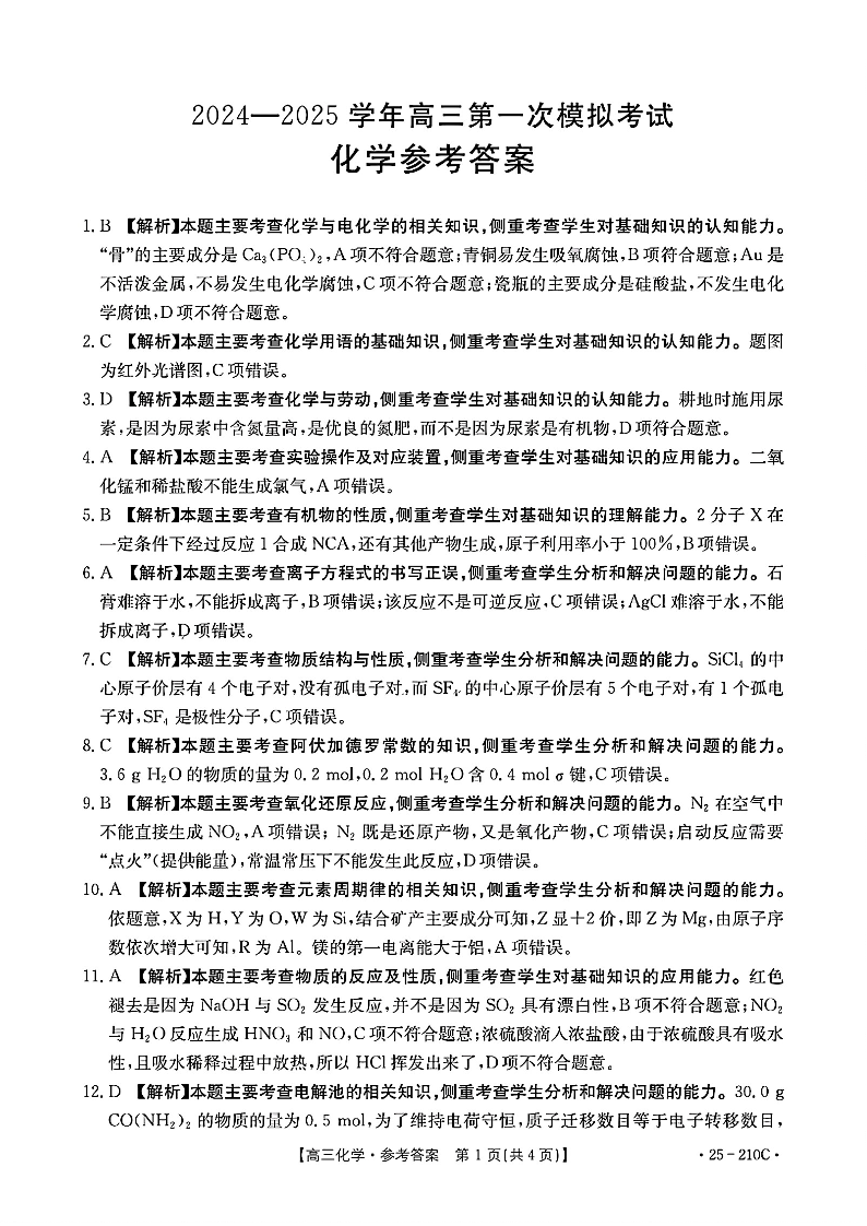 河南省新乡市2024年12月高三年级第一次模拟考试 化学答案