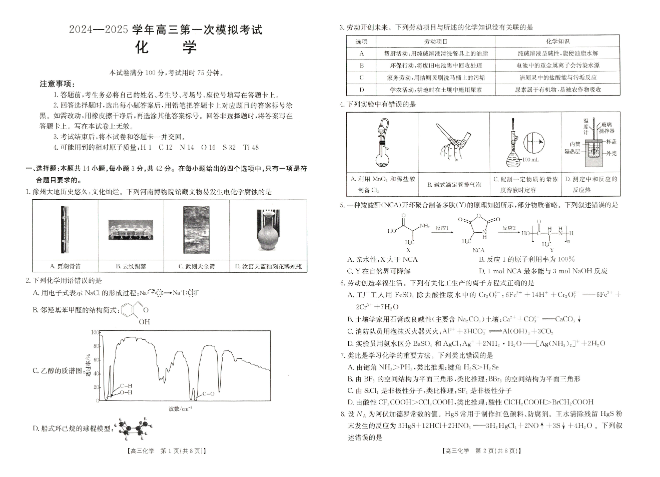 河南省新乡市2024年12月高三年级第一次模拟考试 化学