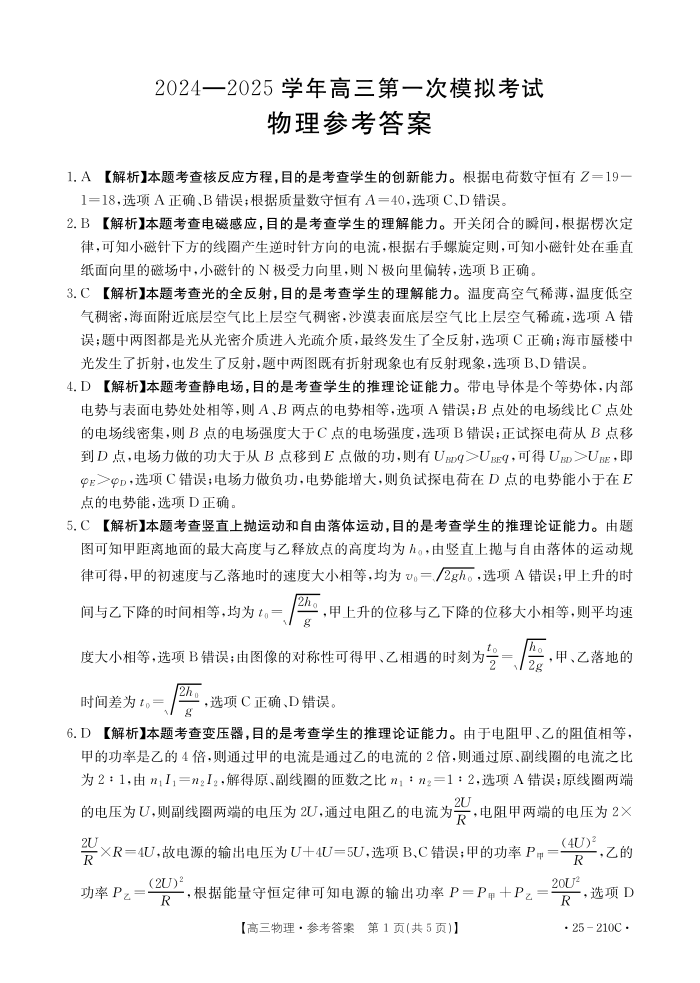 河南省新乡市2024年12月高三年级第一次模拟考试 物理答案