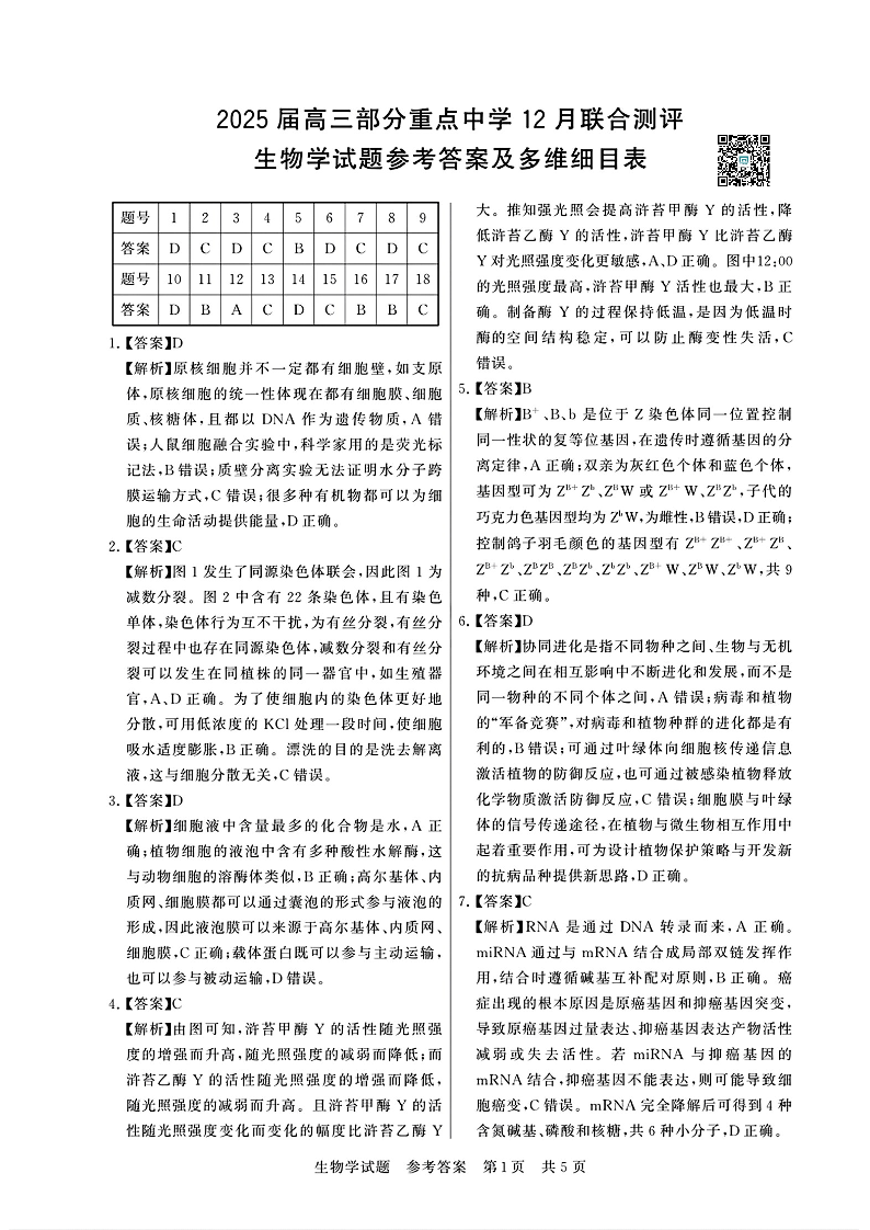 【T8联考】2025届高三部分重点中学12月联合测评 生物答案