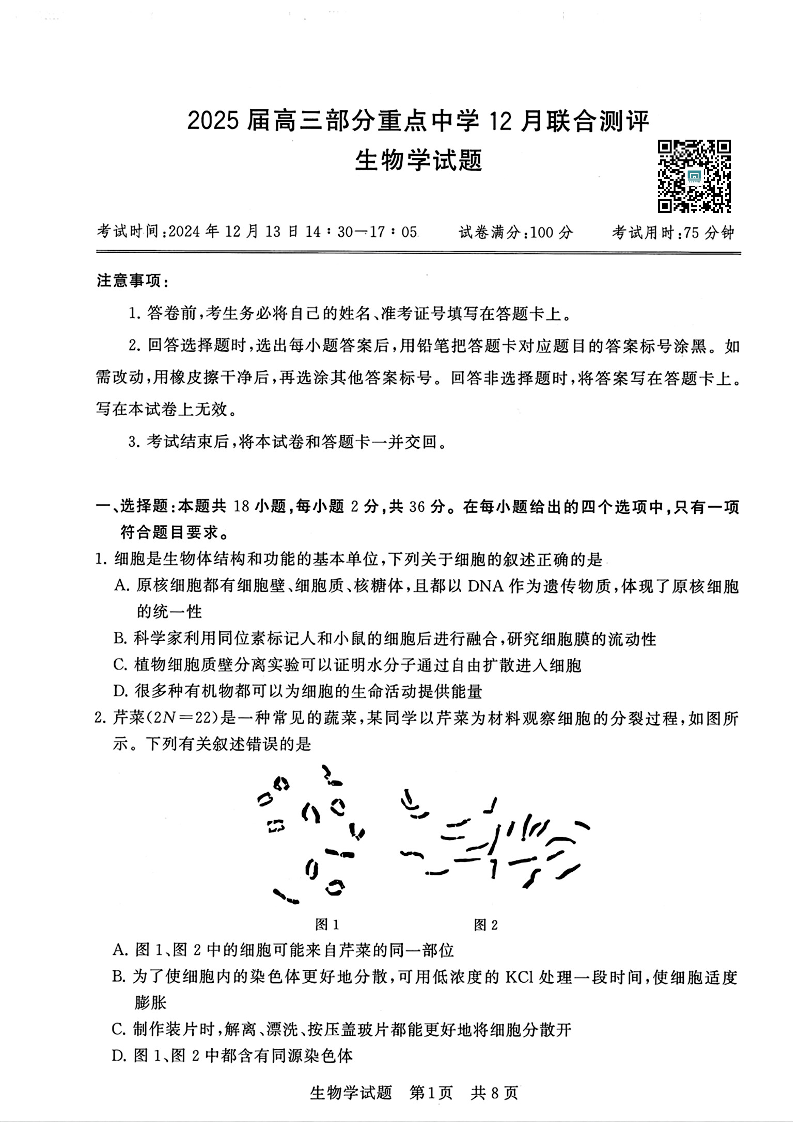 【T8联考】2025届高三部分重点中学12月联合测评 生物