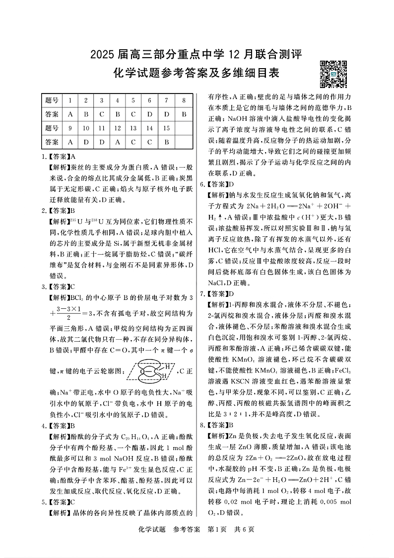 【T8联考】2025届高三部分重点中学12月联合测评 化学答案