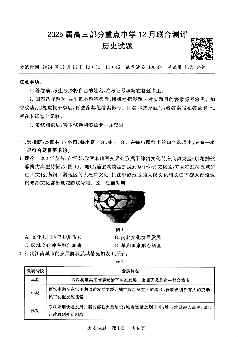 【T8联考】2025届高三部分重点中学12月联合测评 历史