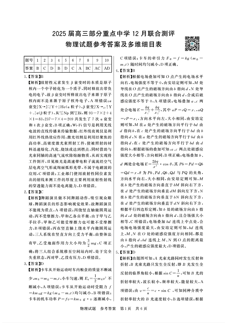 【T8联考】2025届高三部分重点中学12月联合测评 物理答案