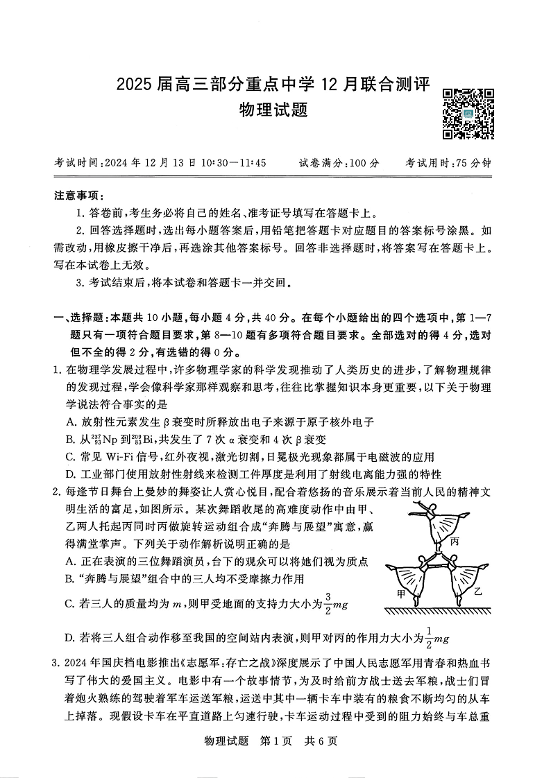 【T8联考】2025届高三部分重点中学12月联合测评 物理