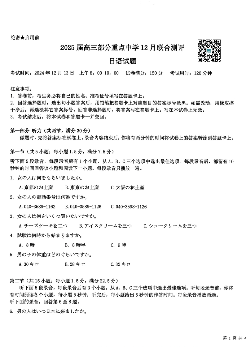 【T8联考】2025届高三部分重点中学12月联合测评 日语