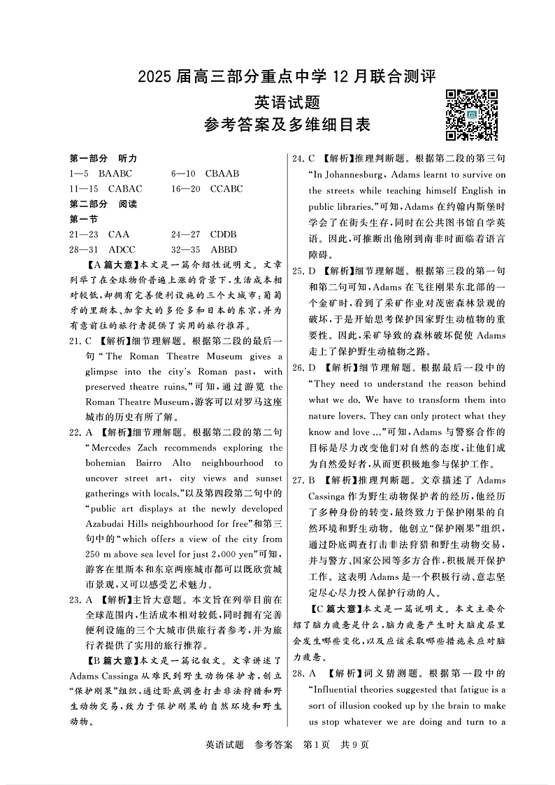 【T8联考】2025届高三部分重点中学12月联合测评 英语答案