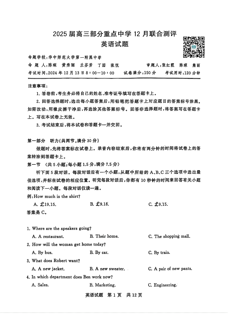 【T8联考】2025届高三部分重点中学12月联合测评 英语