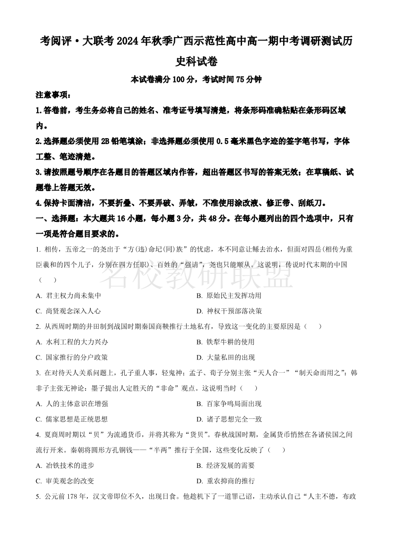 广西壮族自治区玉林市2024-2025学年高一上学期期中考试 历史
