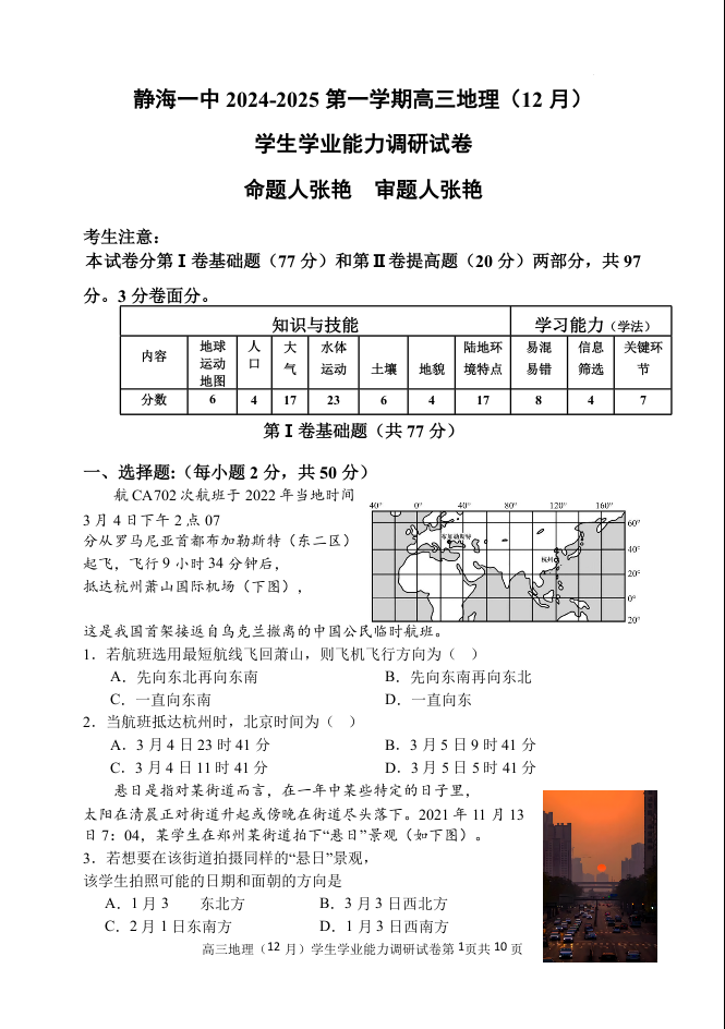 天津市静海区第一中学2025届高三上学期12月月考 地理