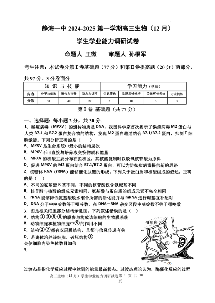天津市静海区第一中学2025届高三上学期12月月考 生物