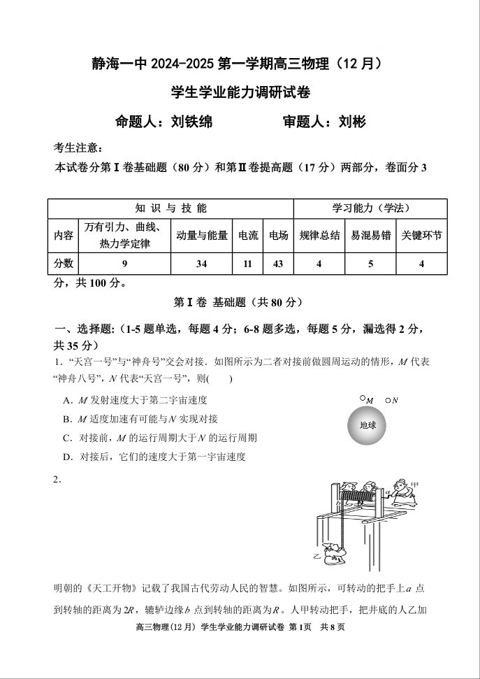 天津市静海区第一中学2025届高三上学期12月月考 物理