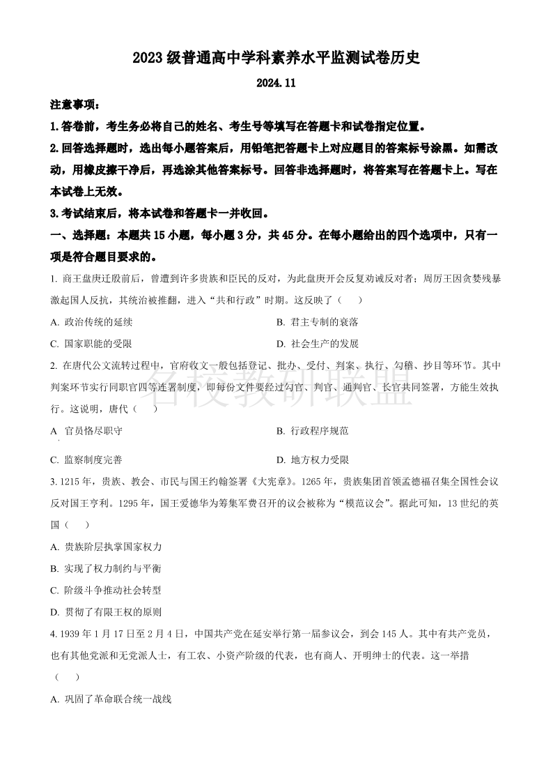 山东省临沂市2024-2025学年高二上学期期中考试 历史