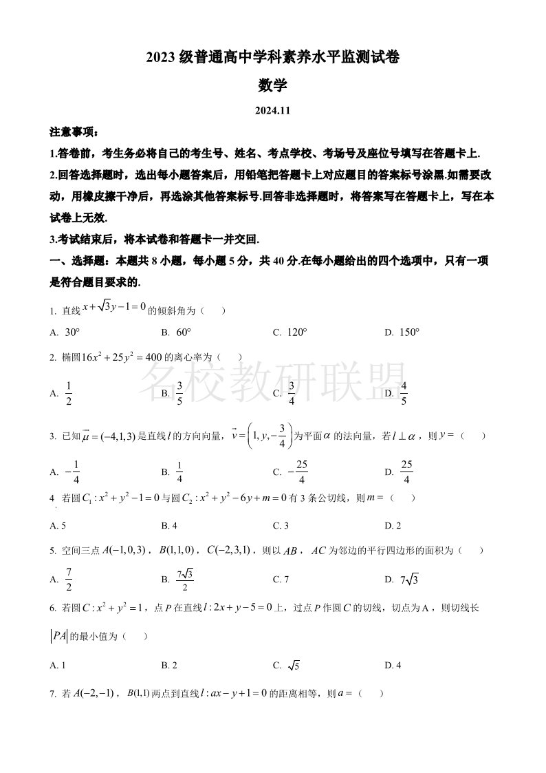 山东省临沂市2024-2025学年高二上学期期中考试 数学