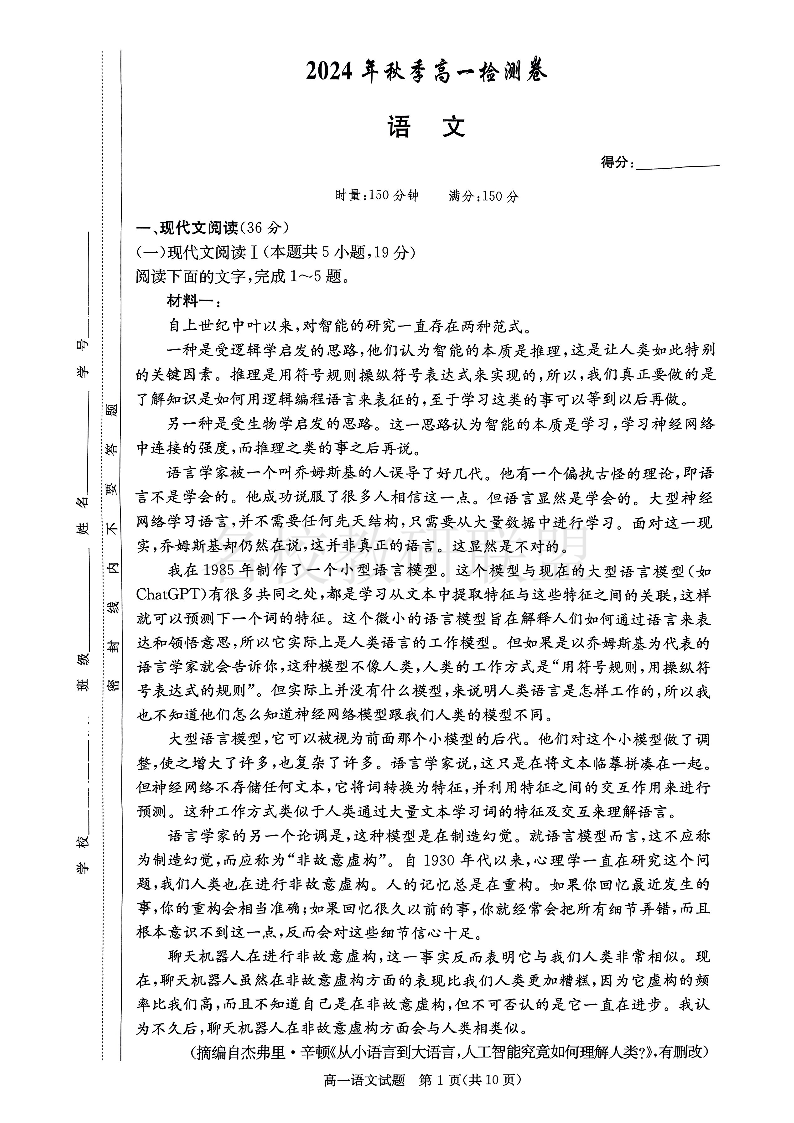湖南省长沙市长郡中学2024-2025学年高一上学期12月月考 语文