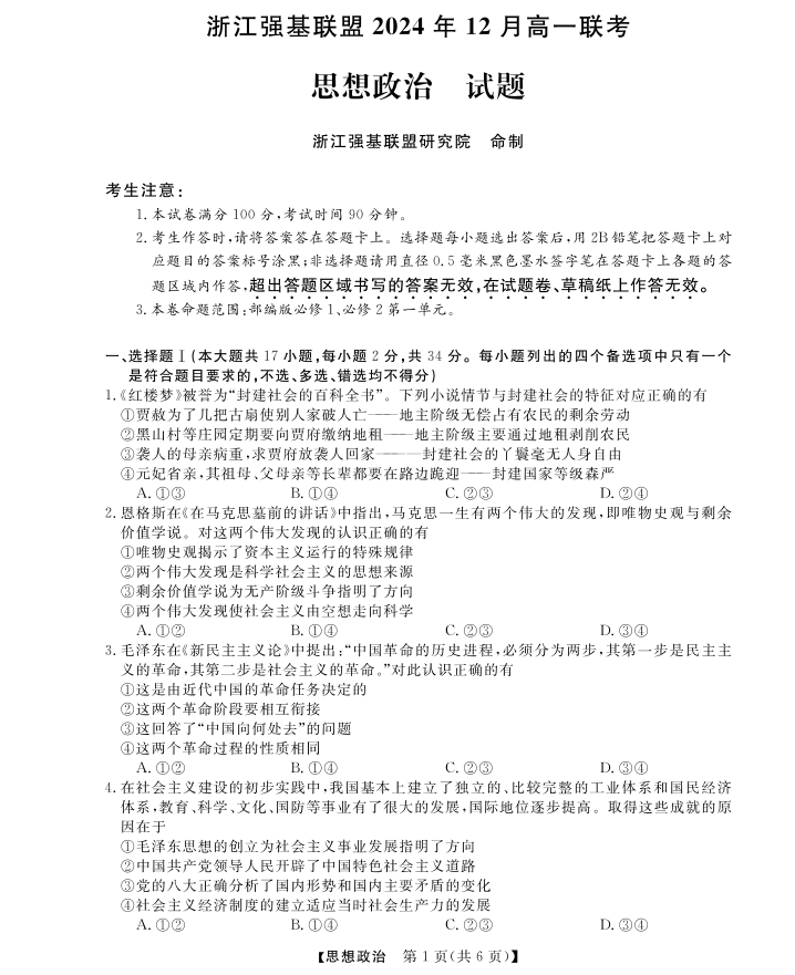 强基联盟高一12月联考--政治
