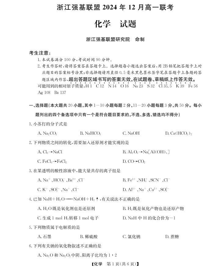 强基联盟高一12月联考--化学