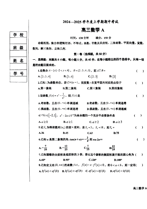 辽宁省鞍山市普通高中2025届高三年级上学期第三次月考 数学