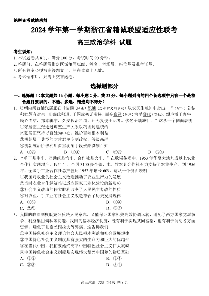 浙江省精诚联盟2024-2025学年高三上学期12月适应性联考 政治