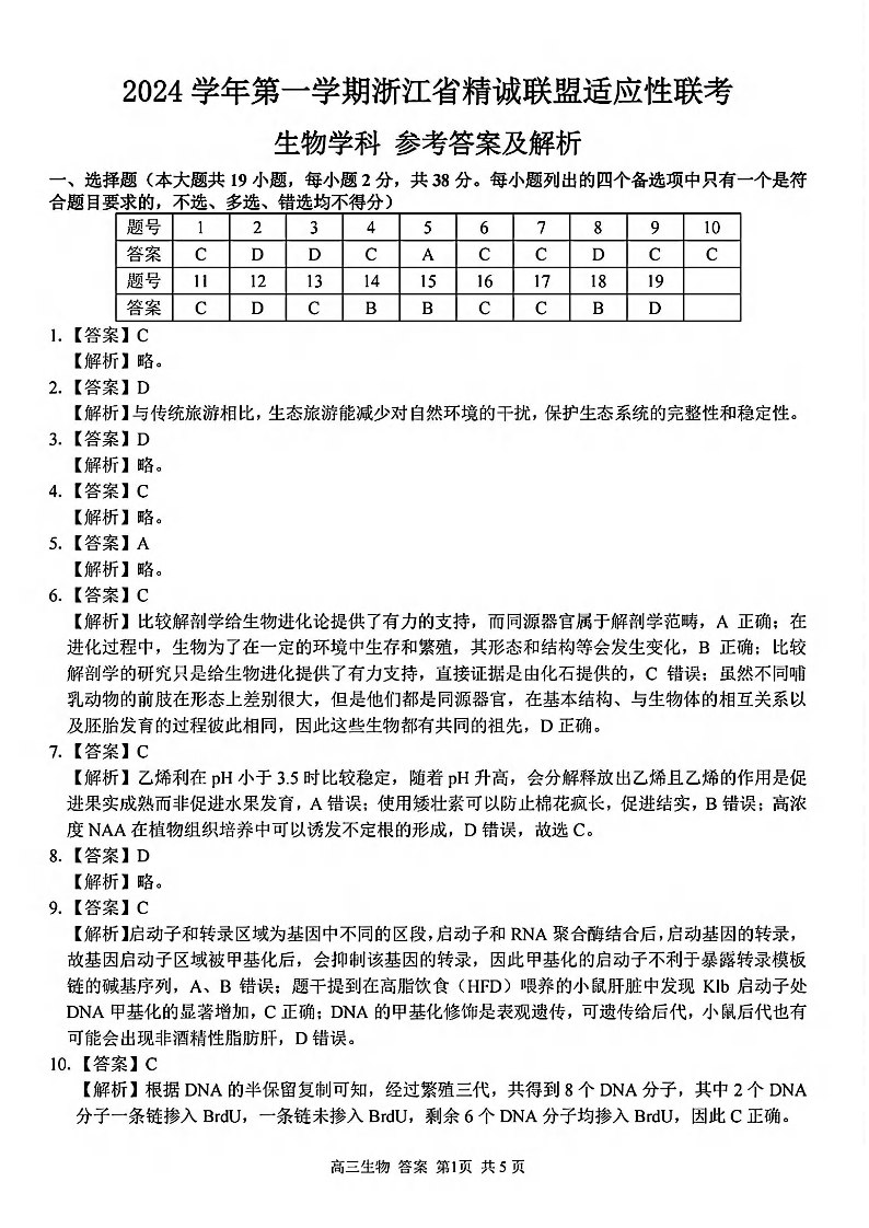 浙江省精诚联盟2024-2025学年高三上学期12月适应性联考 生物答案