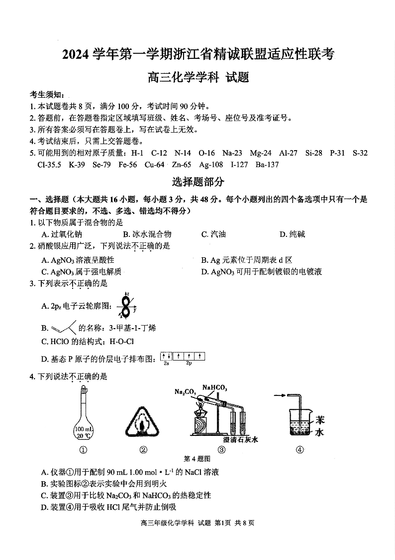 浙江省精诚联盟2024-2025学年高三上学期12月适应性联考 化学