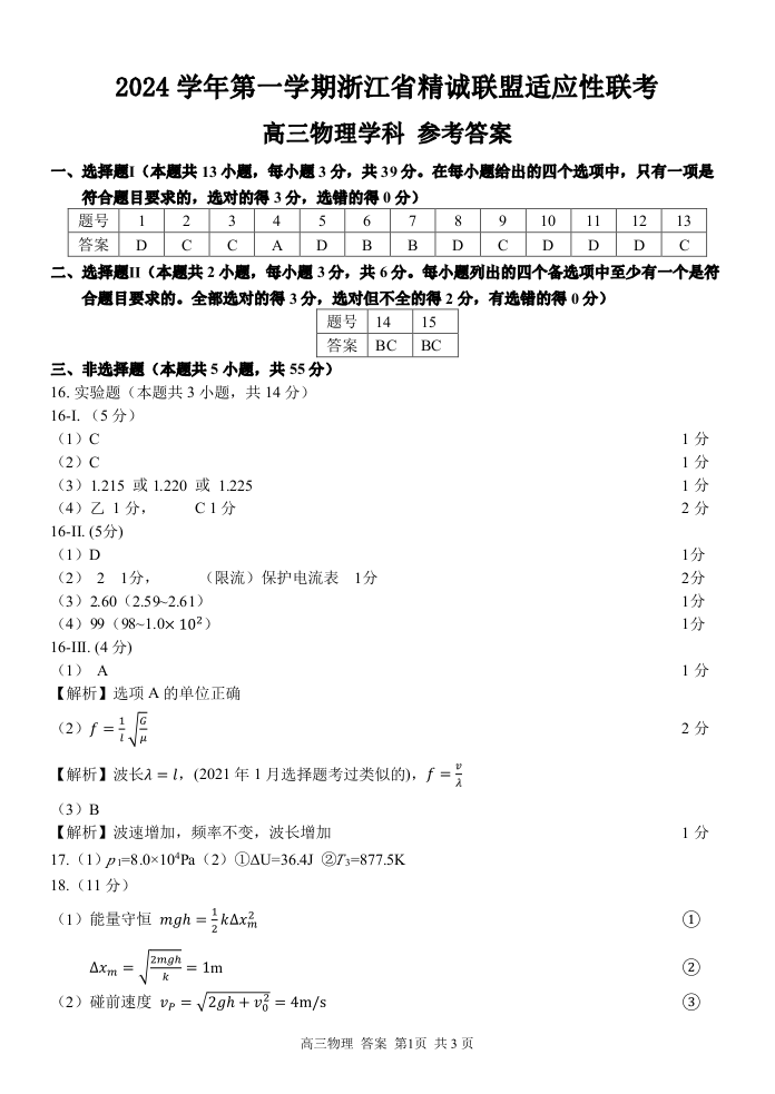 浙江省精诚联盟2024-2025学年高三上学期12月适应性联考 物理答案