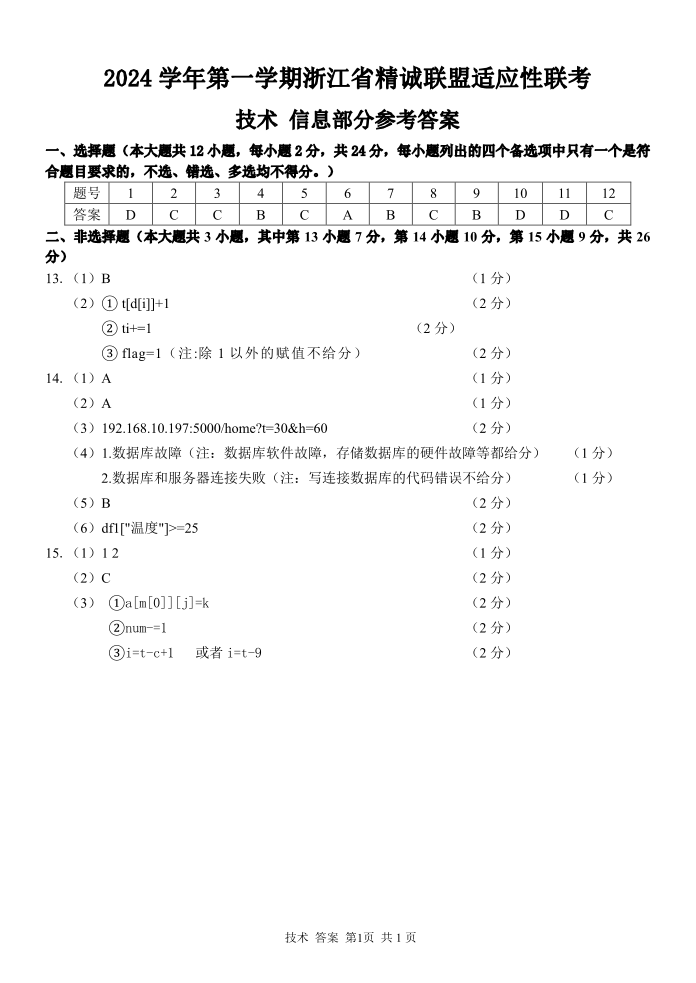 浙江省精诚联盟2024-2025学年高三上学期12月适应性联考 信息答案