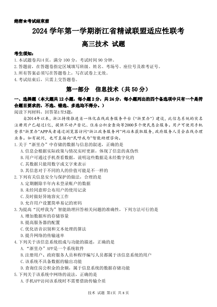 浙江省精诚联盟2024-2025学年高三上学期12月适应性联考 信息