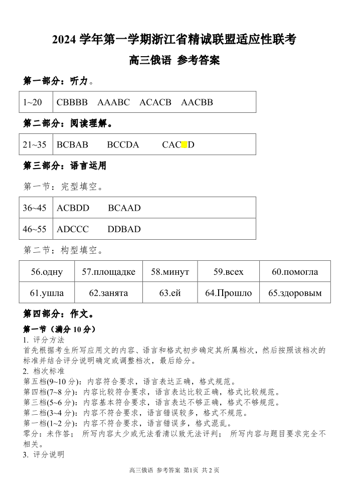 浙江省精诚联盟2024-2025学年高三上学期12月适应性联考 俄语答案