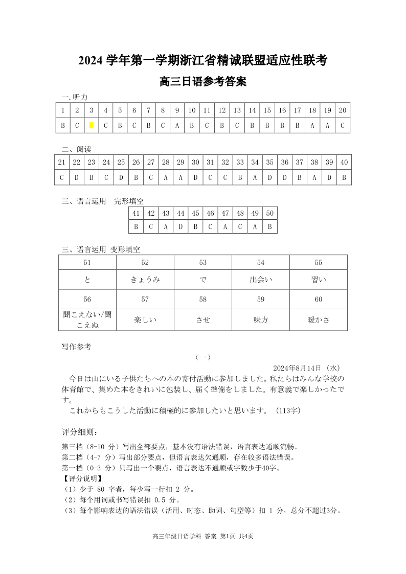 浙江省精诚联盟2024-2025学年高三上学期12月适应性联考 日语答案