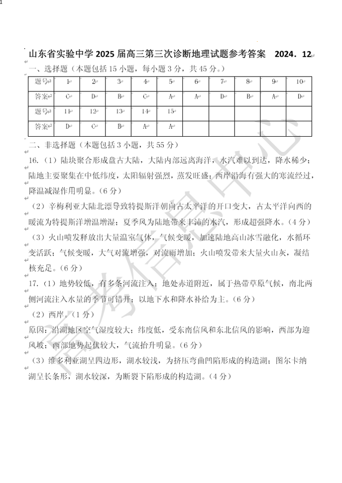 山东省实验中学2025届高三第三次诊断考试 地理答案