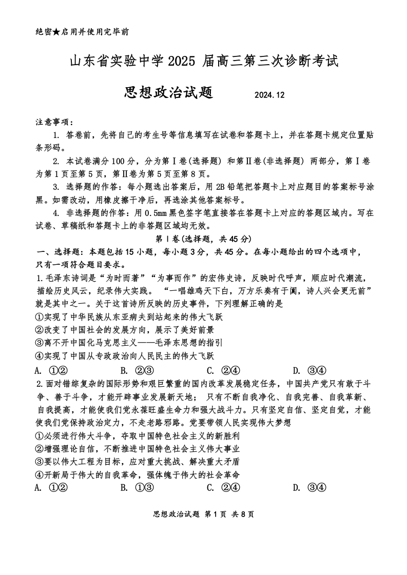 山东省实验中学2025届高三第三次诊断考试 政治