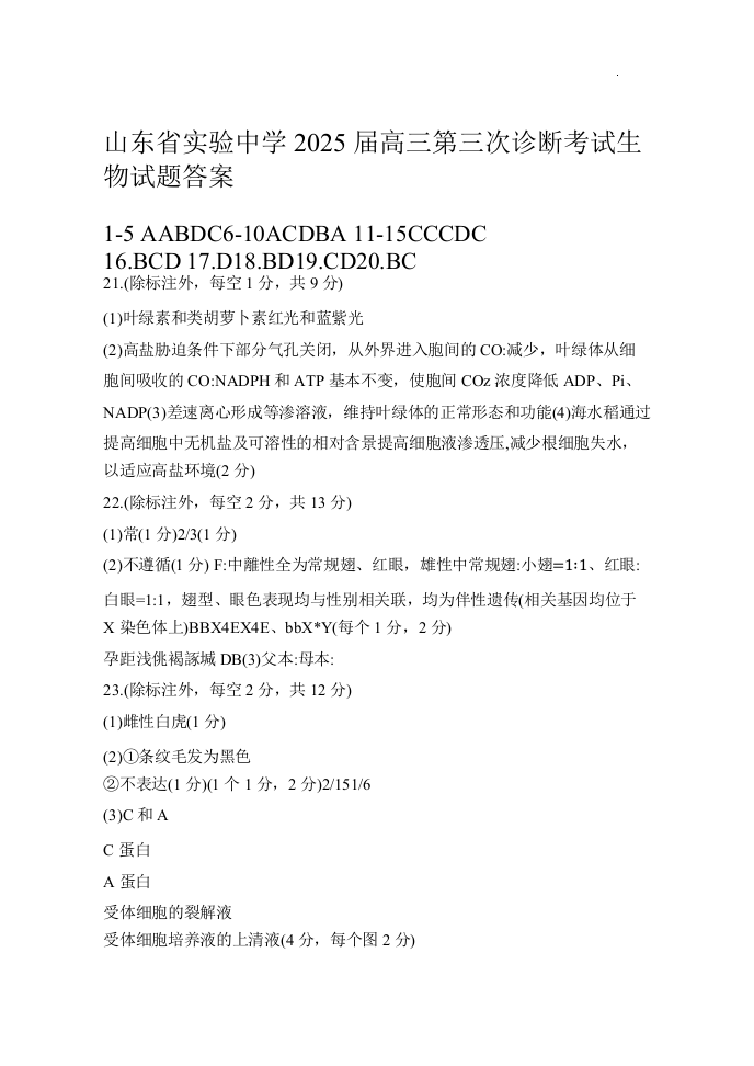 山东省实验中学2025届高三第三次诊断考试 生物答案