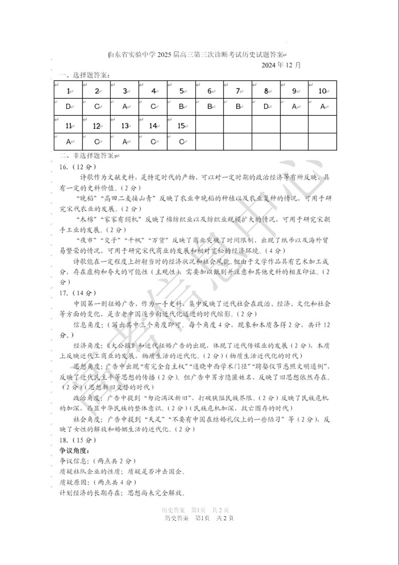山东省实验中学2025届高三第三次诊断考试 历史答案