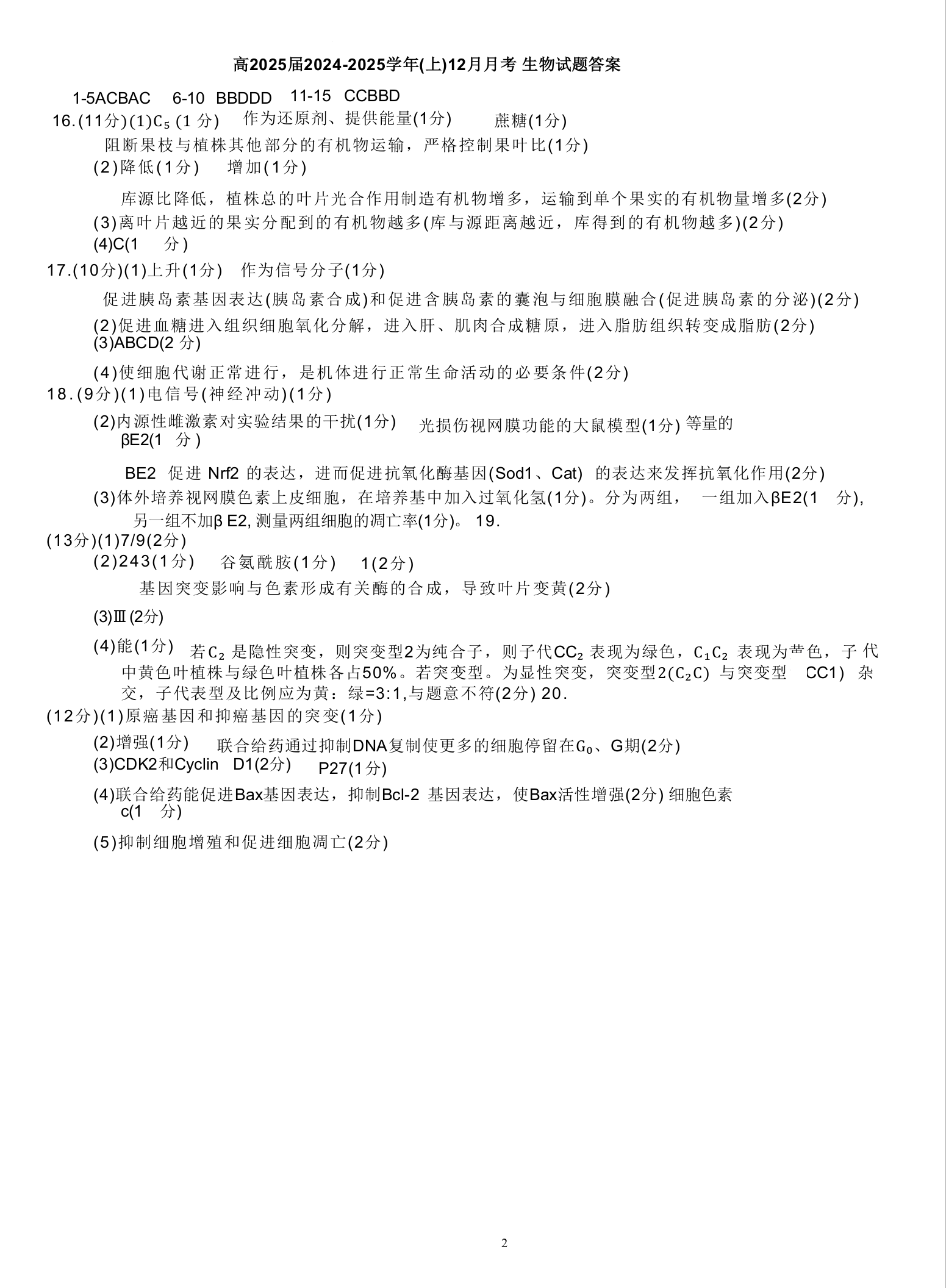 重庆市育才中学校高2025届(上)12月月考 生物答案
