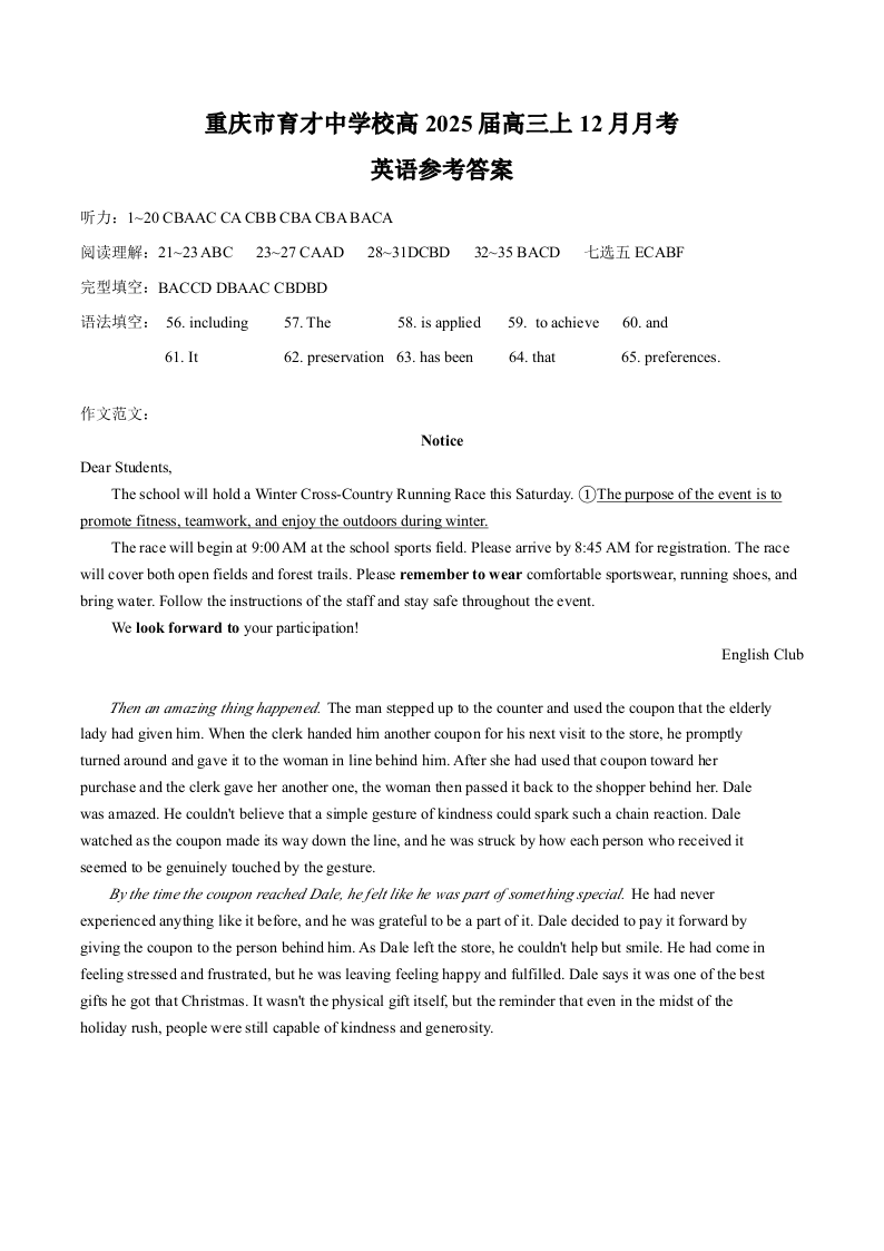 重庆市育才中学校高2025届(上)12月月考 英语答案