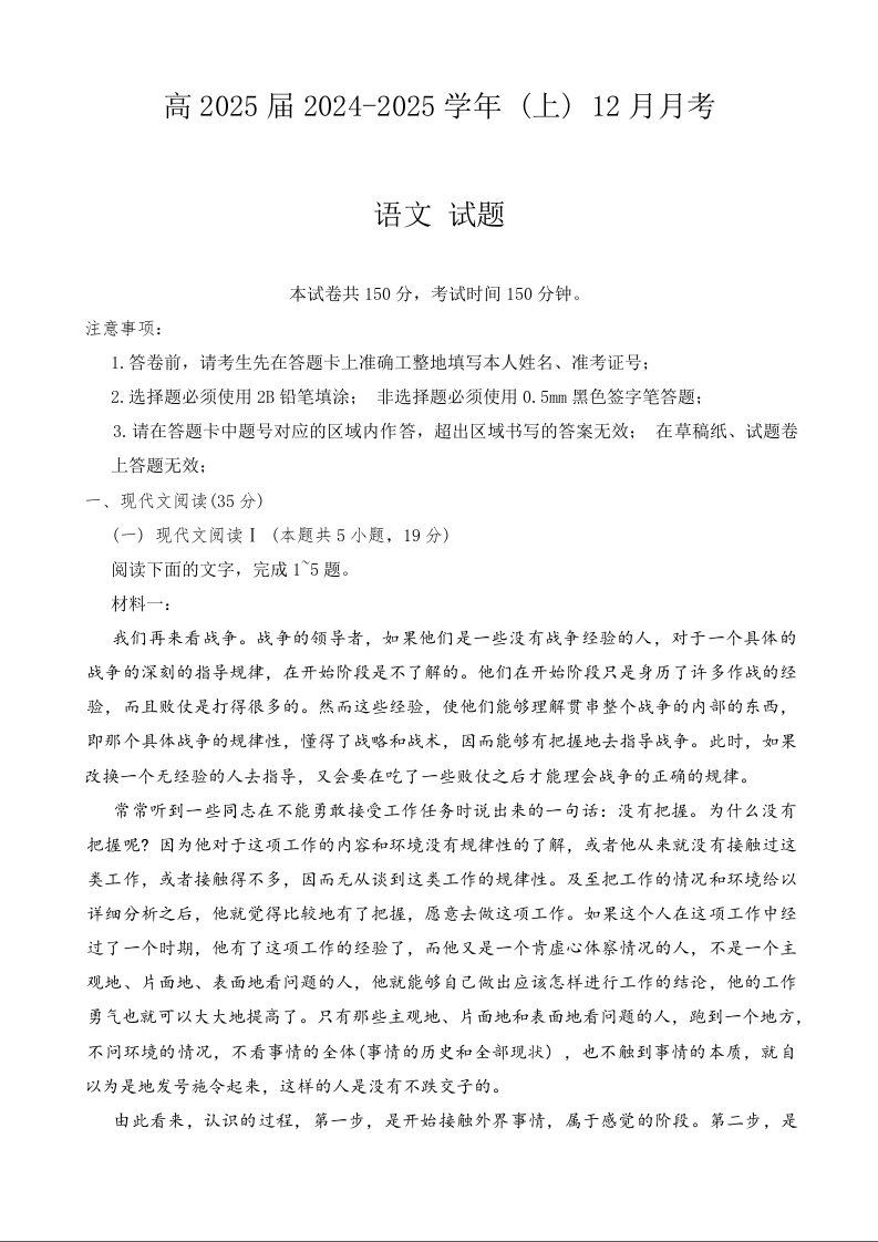 重庆市育才中学校高2025届(上)12月月考 语文