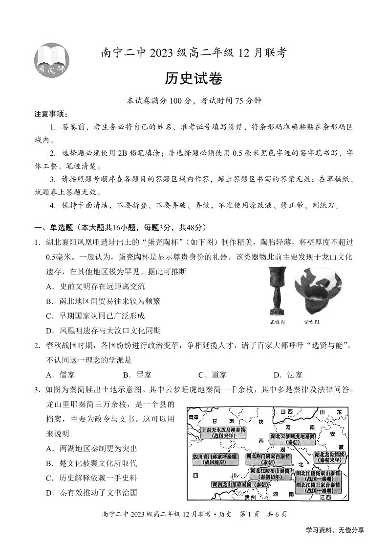 南宁二中2024-12月考高二 历史