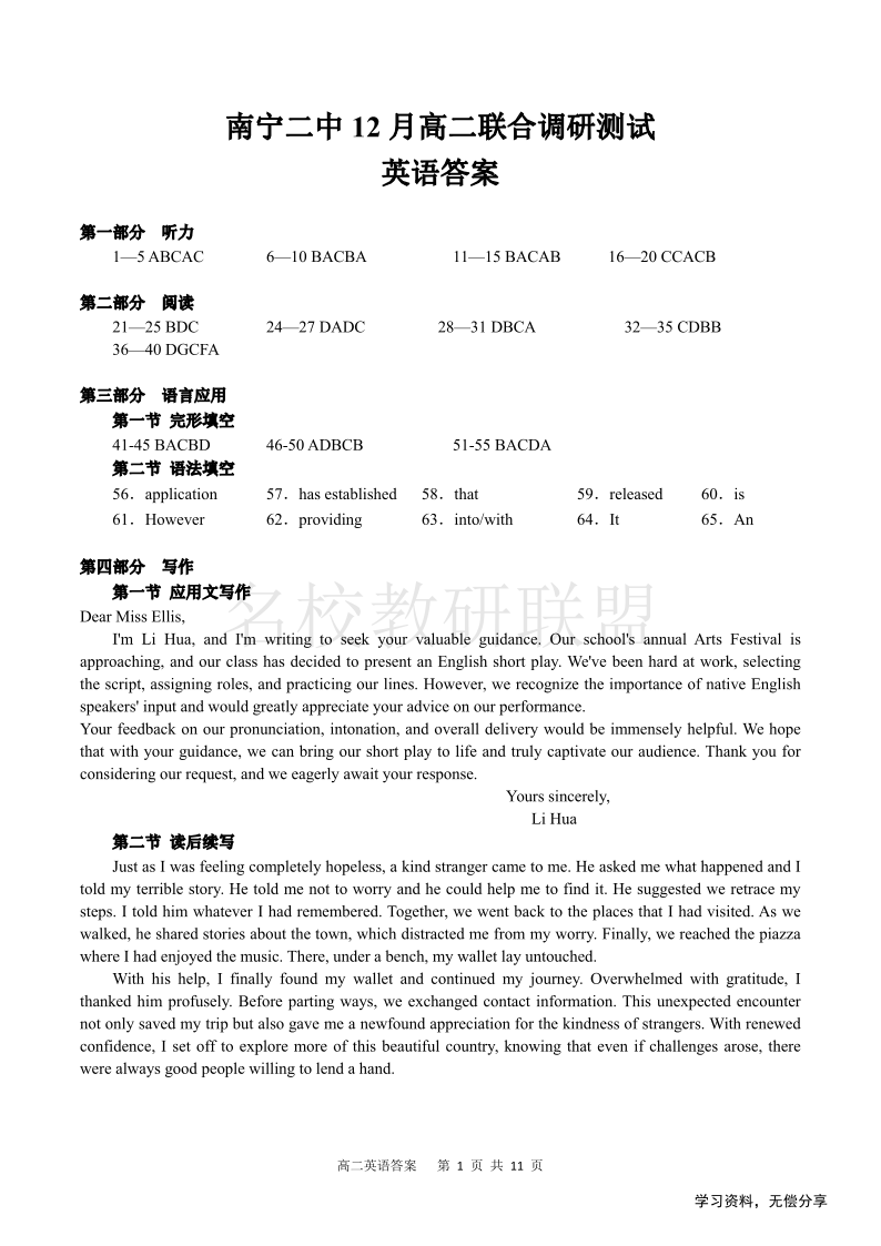 南宁二中2024-12月考高二 英语答案