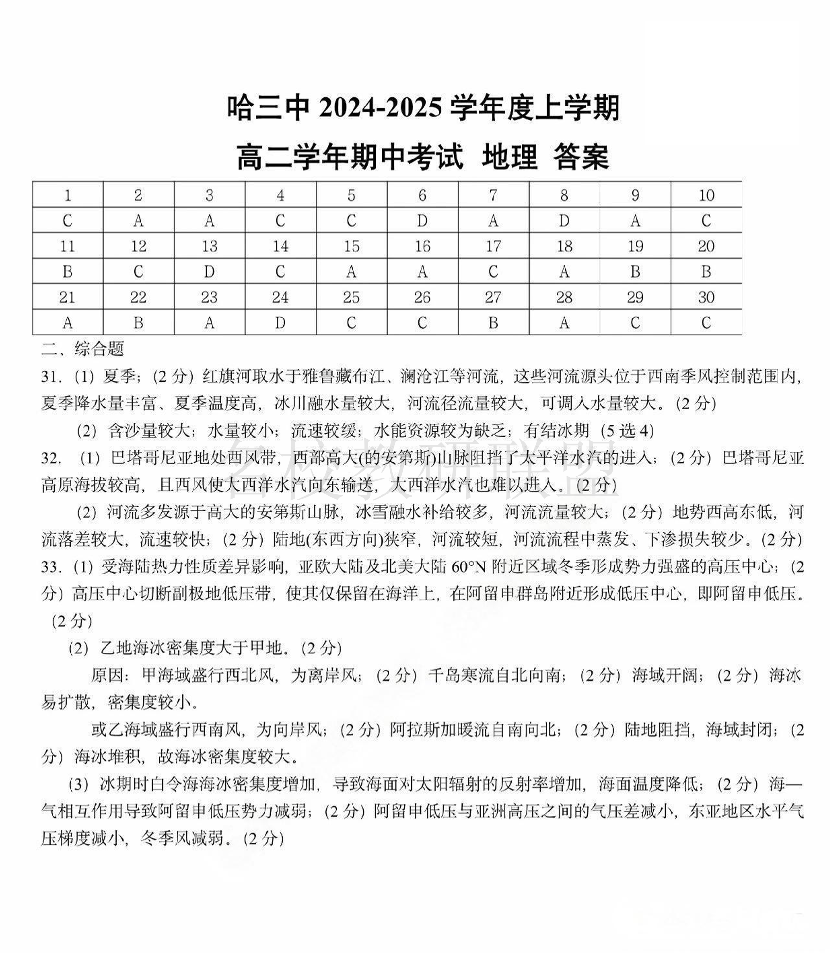 哈三中2024-2025学年度上学期高二学年期中考试 地理答案