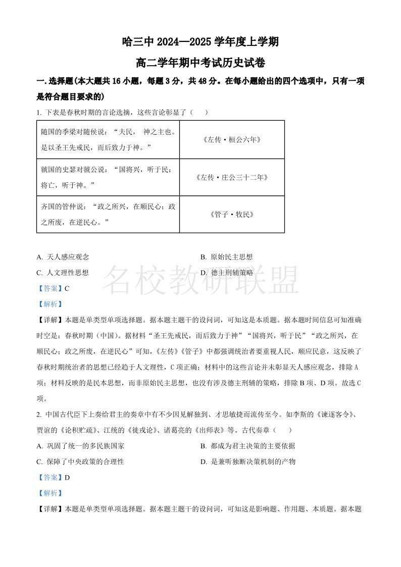 哈三中2024-2025学年度上学期高二学年期中考试 历史答案