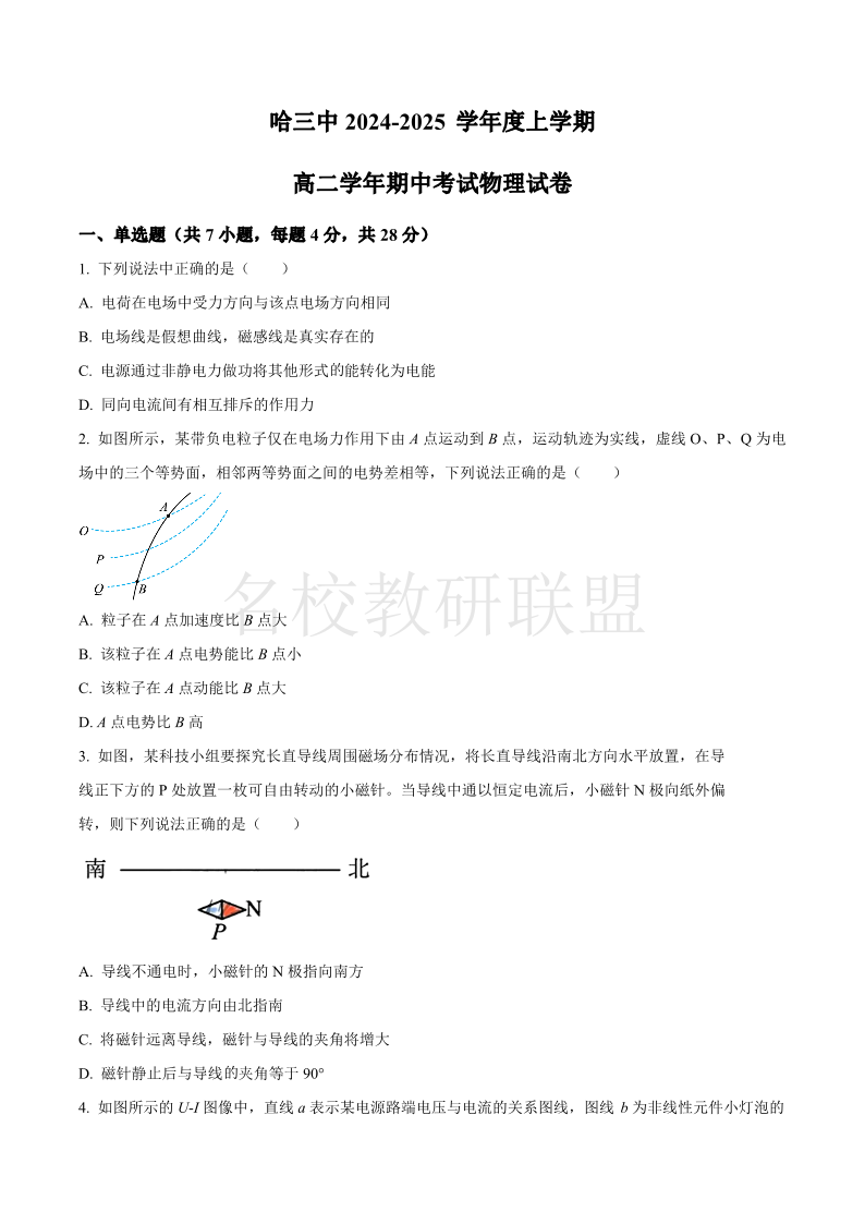 哈三中2024-2025学年度上学期高二学年期中考试 物理