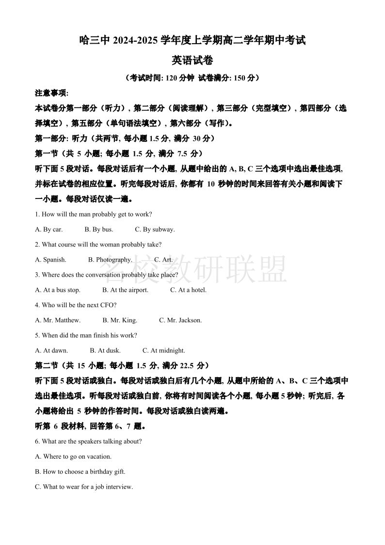 哈三中2024-2025学年度上学期高二学年期中考试 英语答案