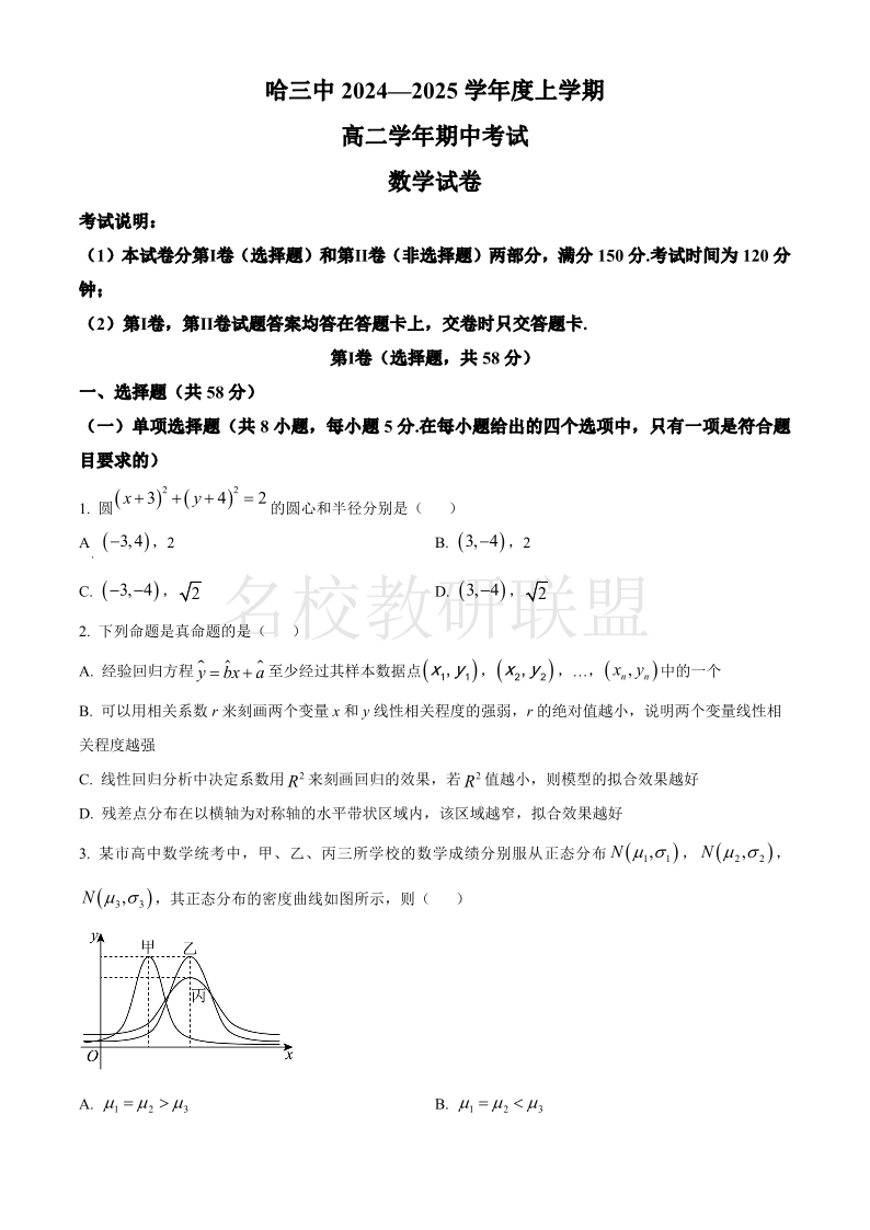 哈三中2024-2025学年度上学期高二学年期中考试 数学