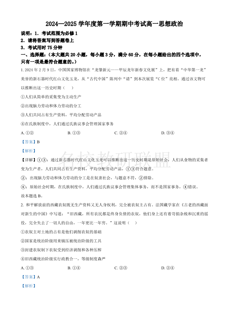 广东省茂名市电白区2024-2025学年高一上学期期中考试 政治答案